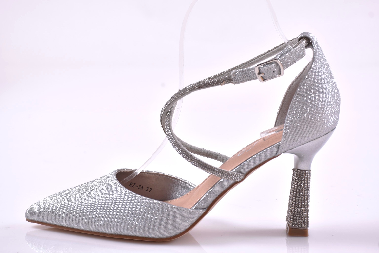 Характеристикa:Височина на ходилото в предната част: 0.5 см. Височина на тока 9 см. Цвят; Сребрист. Номерация:35-39 Моделът е стандартен и отговаря на размерите. Тегло на модела размер 37 218 грама.
