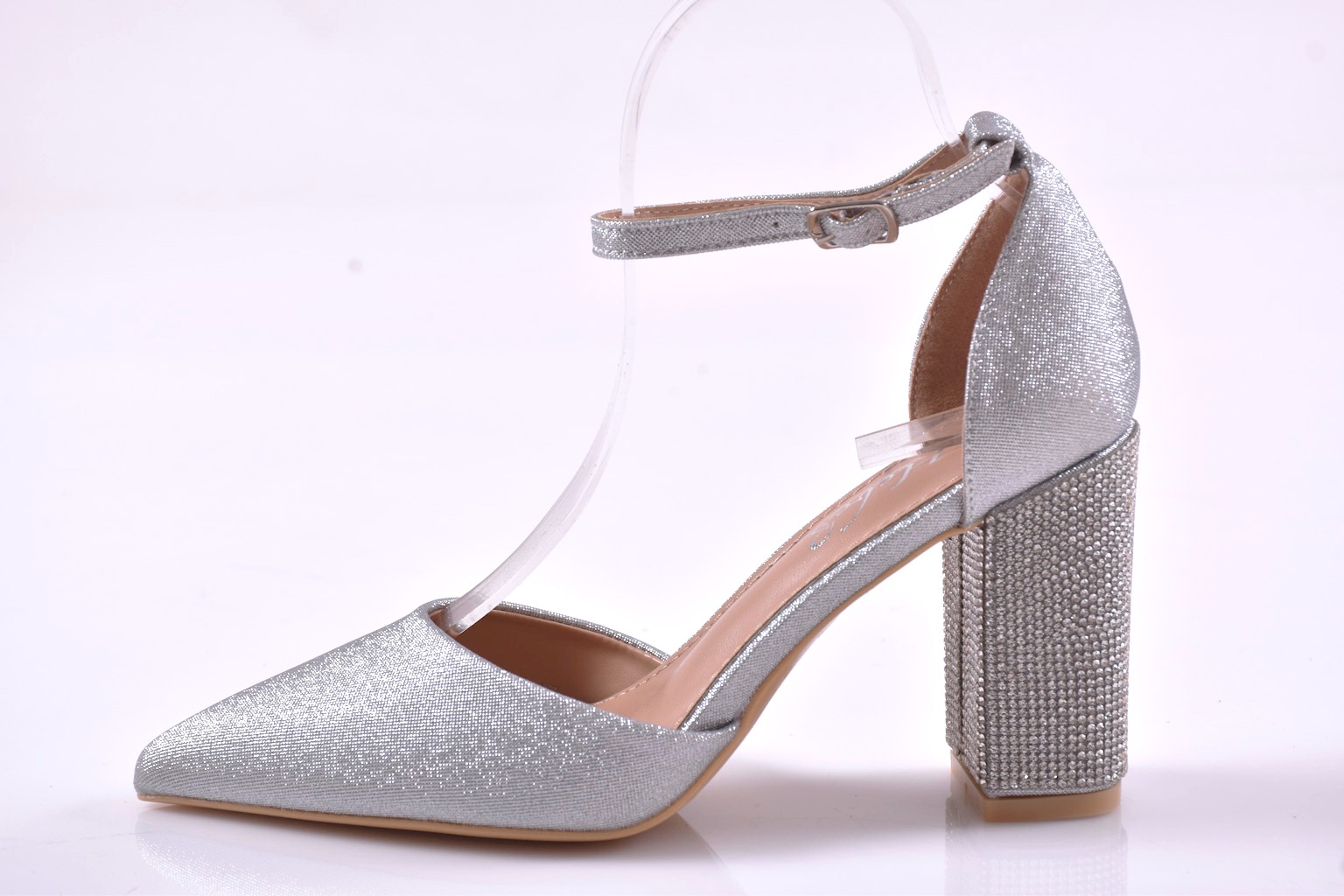 Характеристикa:Височина на ходилото в предната част: 0.5 см. Височина на тока 9 см. Цвят; Сребрист. Номерация:35-40 Моделът е стандартен и отговаря на размерите. Тегло на модела размер 37 254 грама.