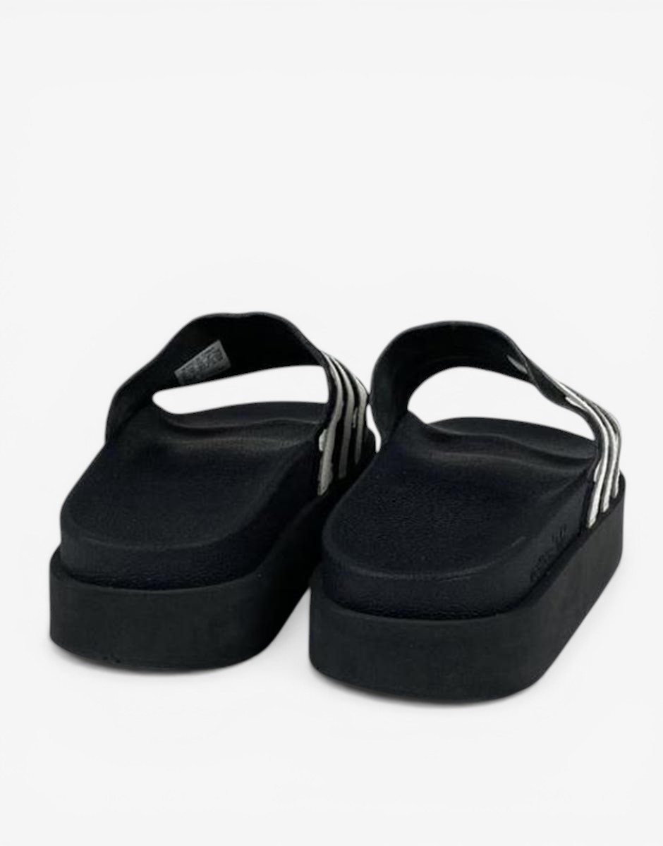 Чудесни дамски джапанки Adidas в черен цвят, изработени от висококачествени материали. Моделът се отличава с емблематичните 3-ленти върху каишката, придаващи автентичен спортен характер. Изработени са от висококачествени материали, включително устойчива горна част и мека, комфортна стелка, която осигурява приятно усещане при всяка стъпка. Платформената подметка добавя височина и модерен акцент, без да прави компромис с удобството. Slip-on дизайнът позволява лесно обуване и събуване, което ги прави практични за ежедневие, плаж или разходка.Черният цвят придава изчистен и универсален стил, който лесно се комбинира с различни визии - от спортни до streetwear аутфити.