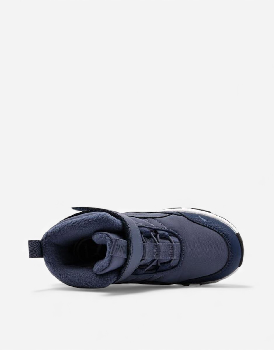 Страхотни детски зимни обувки Puma в син цвят , изработени от висококачествени топлоизолиращи материали. Горната част е изградена от здрава шушлякова материя и подсилващи елементи от еко кожа. Добавена е и велкро лепенка, която лесно се регулира спрямо широчината на ходилото. Двойният шев дава възможност да я скъсите с ножица, спрямо индивидуалните нужди на детето. Ластичните връзки, позволяват на обувката да прилепне плътно и комфортно към детското краче. Вътрешността разполага с подплатa, която поддържа топлината и изолира от студа. Пръстите са предпазени от външни наранявания с борд. Стелката е снабдена с технология Kinder Fit, която дава възможност да отстраните стелката от обувката, за да наложите крачето върху специалните ѝ очертания. Така ще бъдете сигурни, че зимните обувки са точния размер и пасват перфектно на детето. Междинната подметка е от омекотяваща пяна, която абсорбира напрежението, образувано при стъпване. Грайферът е направен от издръжлива на износване гума и създава отлично сцепление. Перфектно се съчетават с дънки.